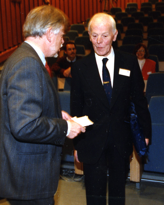 Utöver det förnämliga Laskerpriset fick Inge Edler år 1991 Sten K. Fernströms Stora Nordiska Pris 1991. På bilden instrueras Inge Edler av medicinska fakulteten i Lunds dekanus, Per Belfrage, inför prisutdelningsceremonin.
