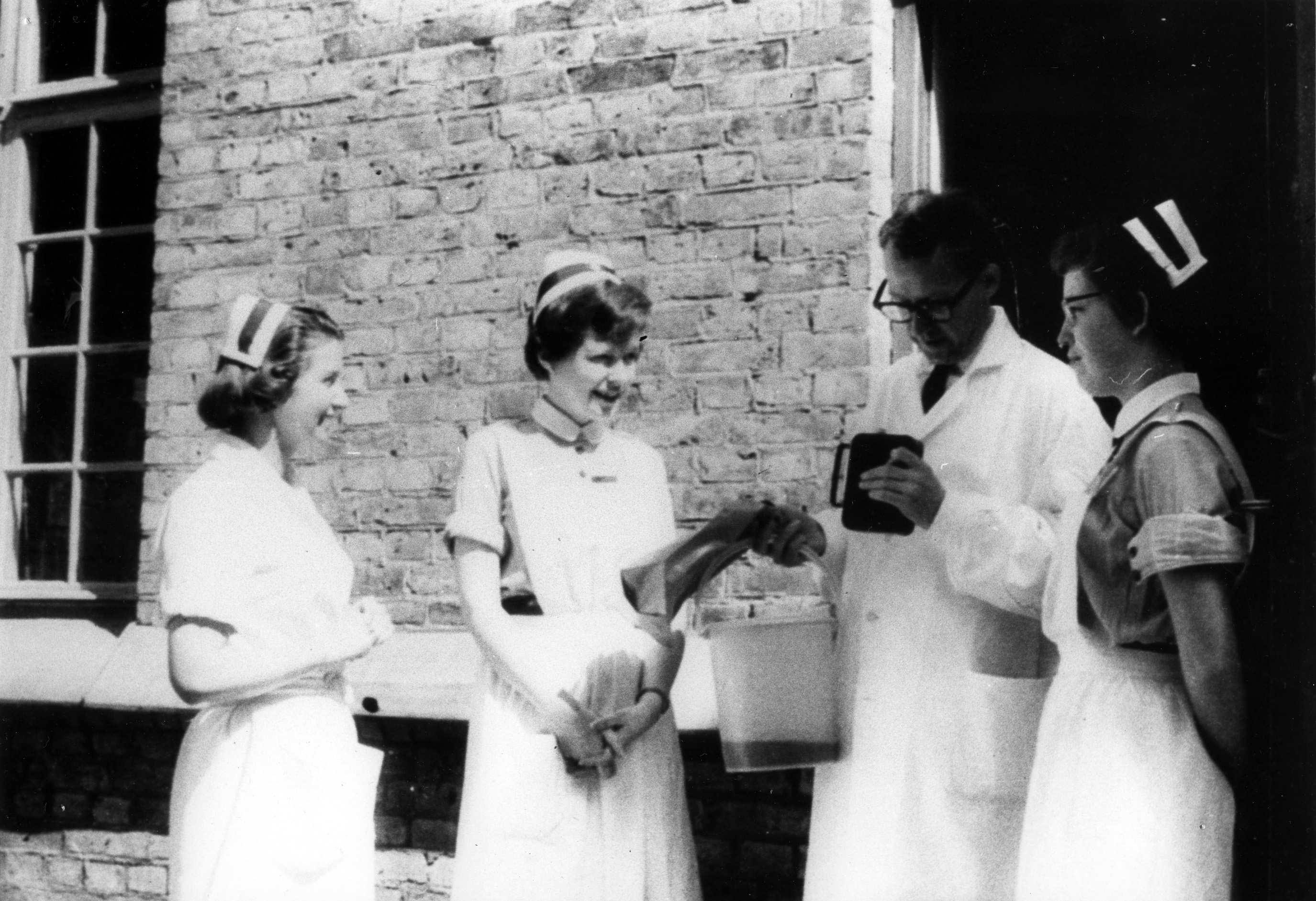 Längst till vänster Syster Maj-Britt Jönsson. Undersläkaren är Lennart Andersson, senare professor i urologi i först Umeå och senare i Stockholm. Han är just på väg till Koagulationslaboratoriet i Malmö med ett urinprov i spannen, för analys av fibrinolyshämmaren epsilonaminokapronsyra. I vänster hand har han troligen en bandspelare/diktafon av fabrikatet Sony, högmodern den gången.