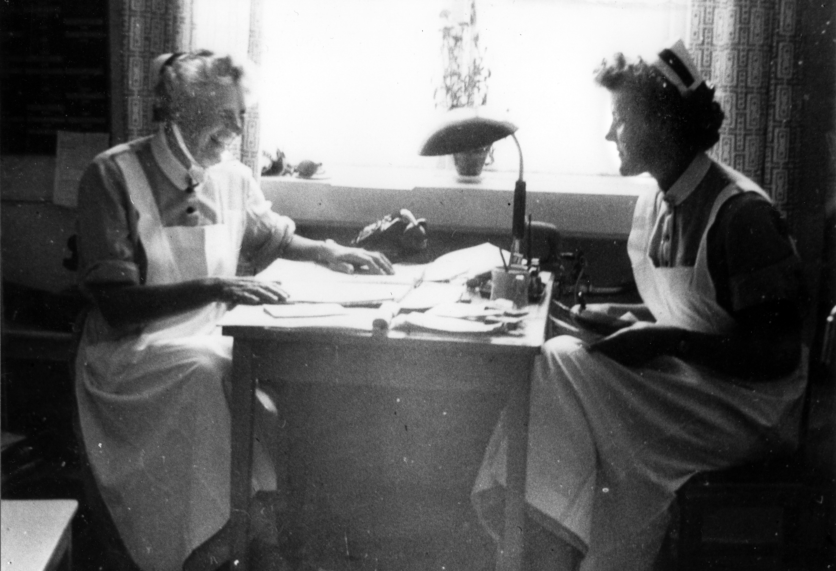 Avdelningsföreståndaren under lång tid på urologiska kliniken i Lund i gamla kirurgibyggnaden, Marta Ängeby (1908-2003), i samtal med en yngre kollega.