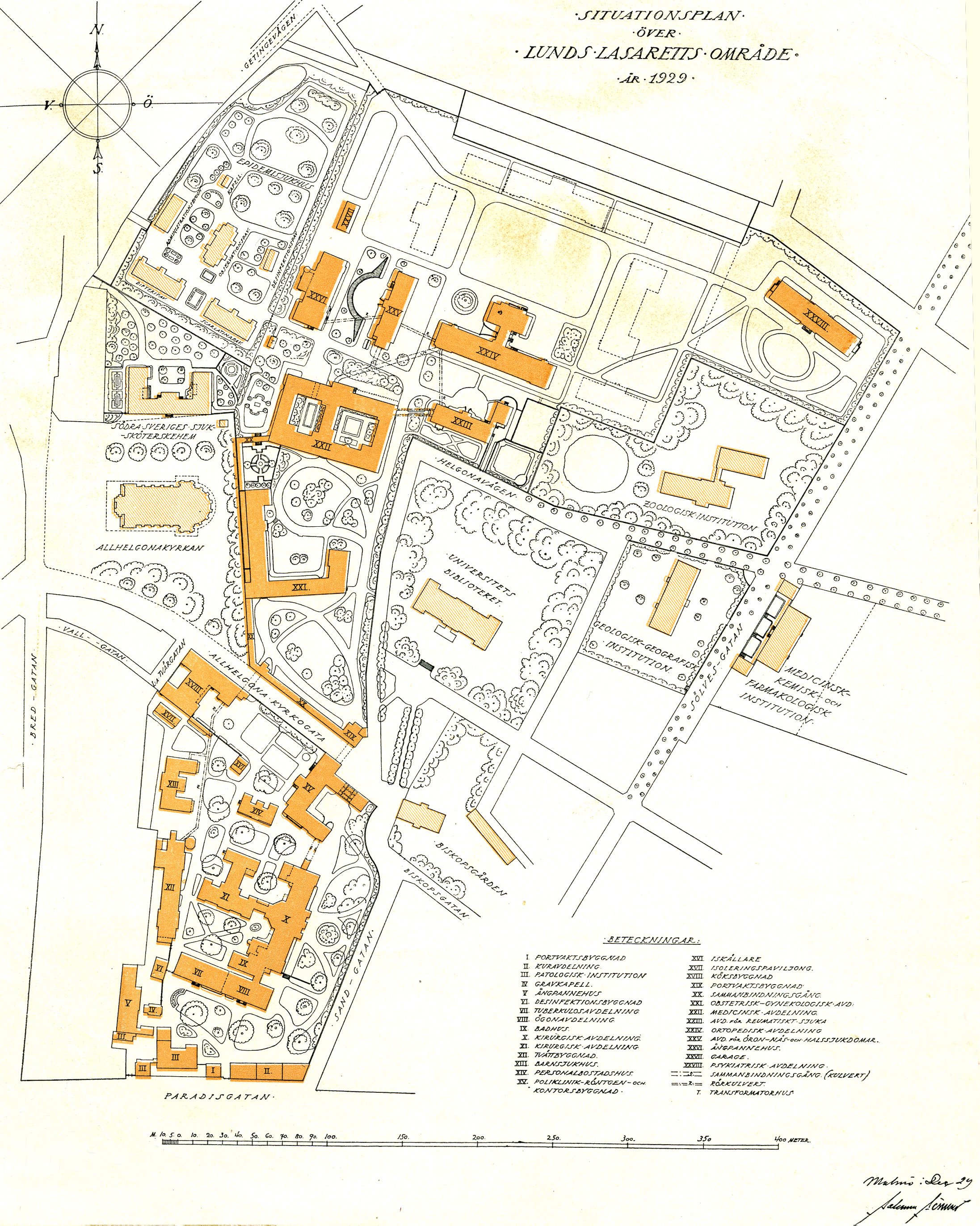 Planritning över Lunds Lasarett efter det öronkliniken, ortopediska kliniken och psykiatriska kliniken tillkommit år 1929. Epidemisjukhuset och Sköterskehemmet är också byggda.