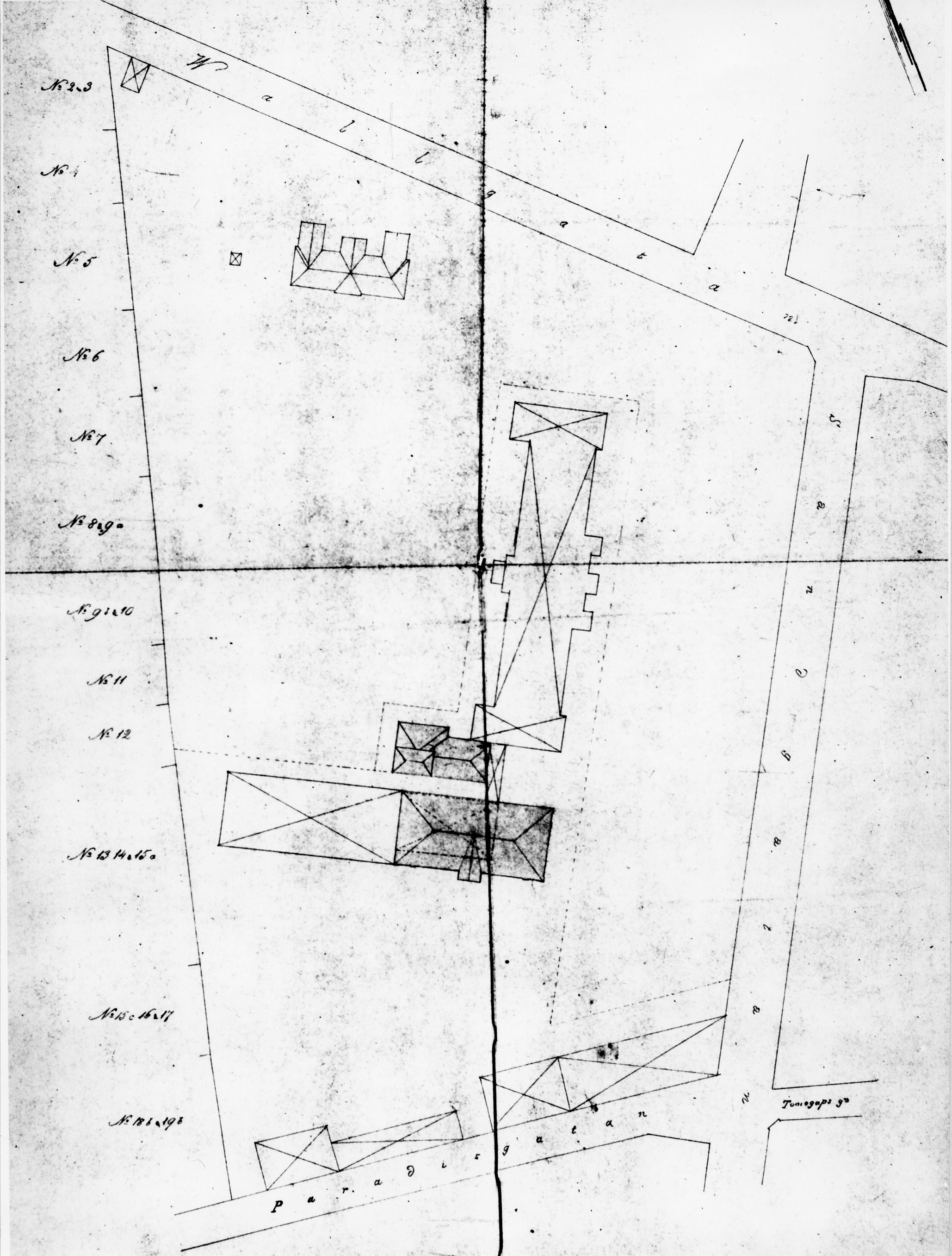 Karta över en del av tomten no 20, Paradislyckan, i Lund, tillhörig Malmöhus läns lasarett, upprättad år 1876 och kompletterad år 1884.