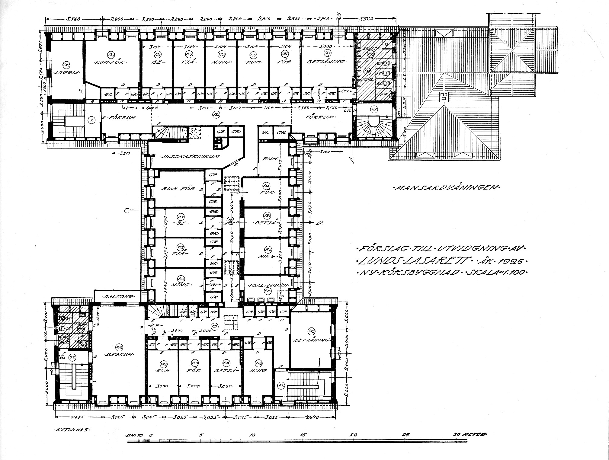 Förslag till ny köksbyggnad, mansardvåningen, Lasarettet i Lund 1926.