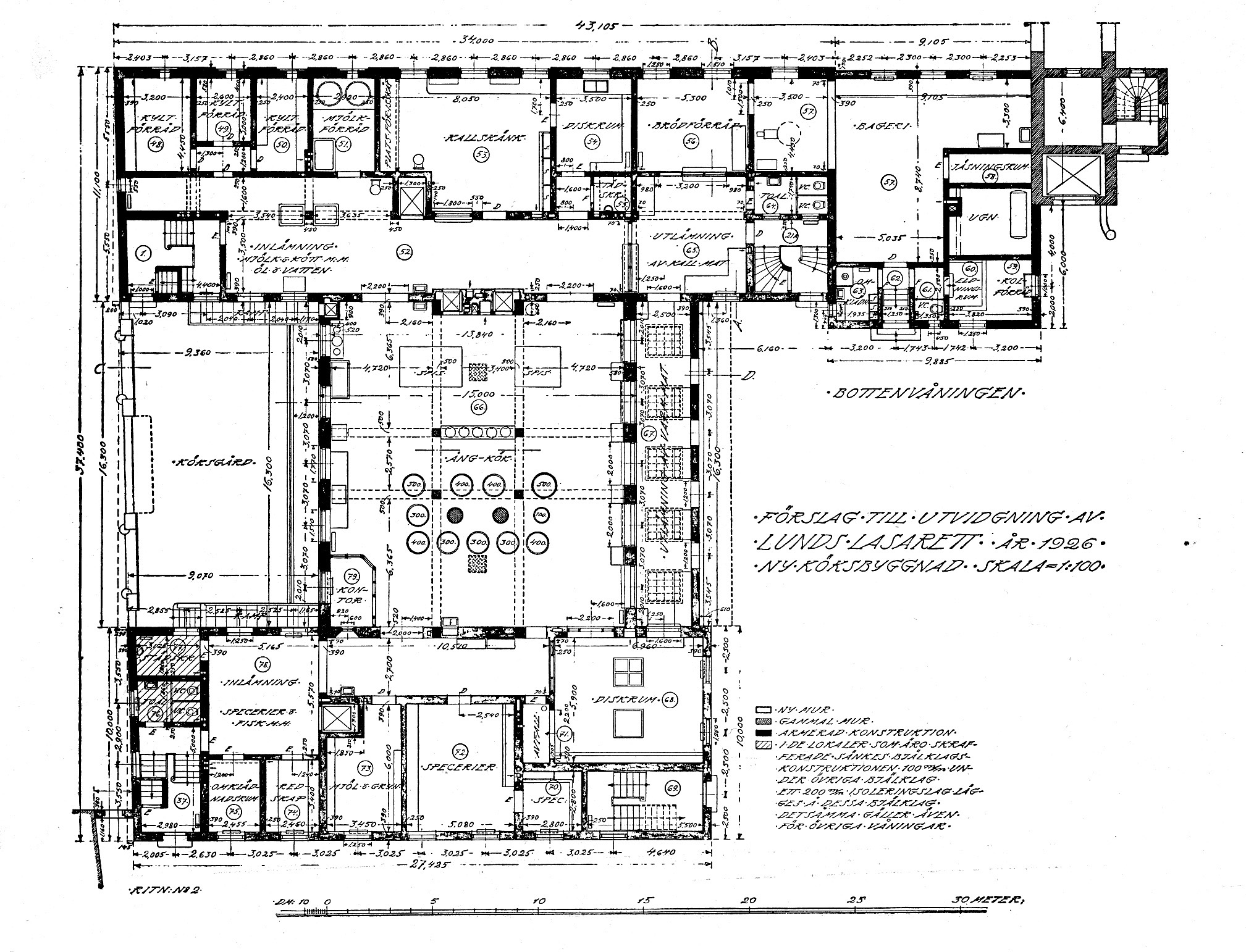 Förslag till ny köksbyggnad, bottenvåningen, Lasarettet i Lund 1926. Köket stod färdigt 1929.