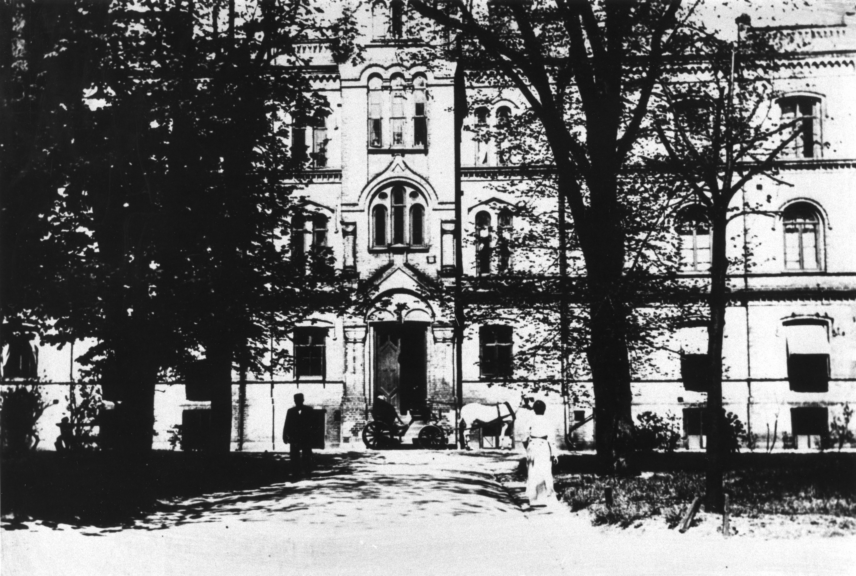 Gamla ögonkliniken, söderfasaden. Lasarettsdirektör Nils Olsson Gadde i trillan. Huset byggdes 1884 - 1886 för ursprungligen ögonklinik, föreläsningssal, lasarettskontor och direktionsrum. I källaren låg i lasarettskök och bad. I början på 1900-talet gjordes hela huset till ögonklinik, länge den största i landet.