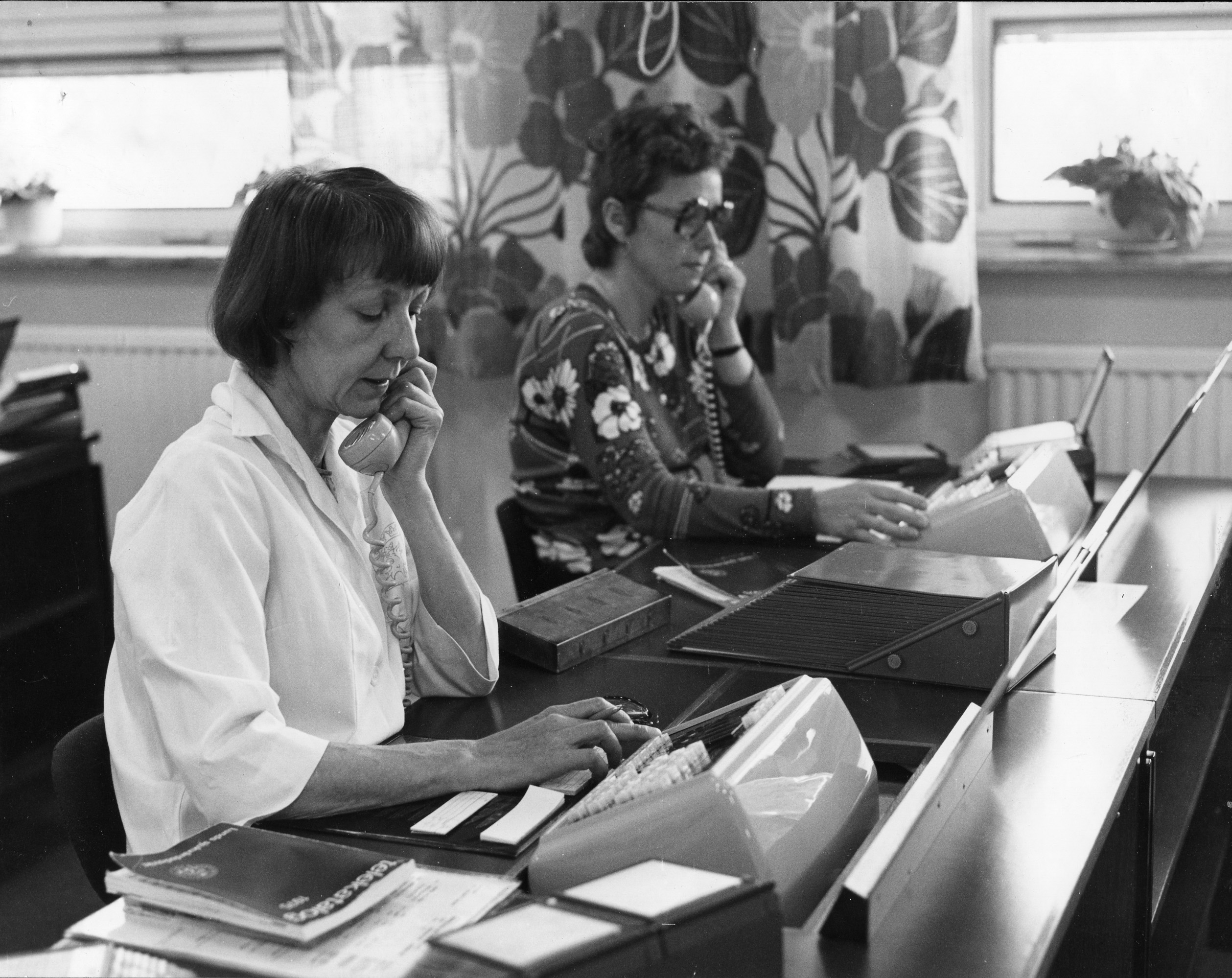 Lasarettets telefonväxel 1976, då tämligen nyinflyttad i samma byggnad som centralköket. Jfr bild 100911-014, tagen vid samma tillfälle.