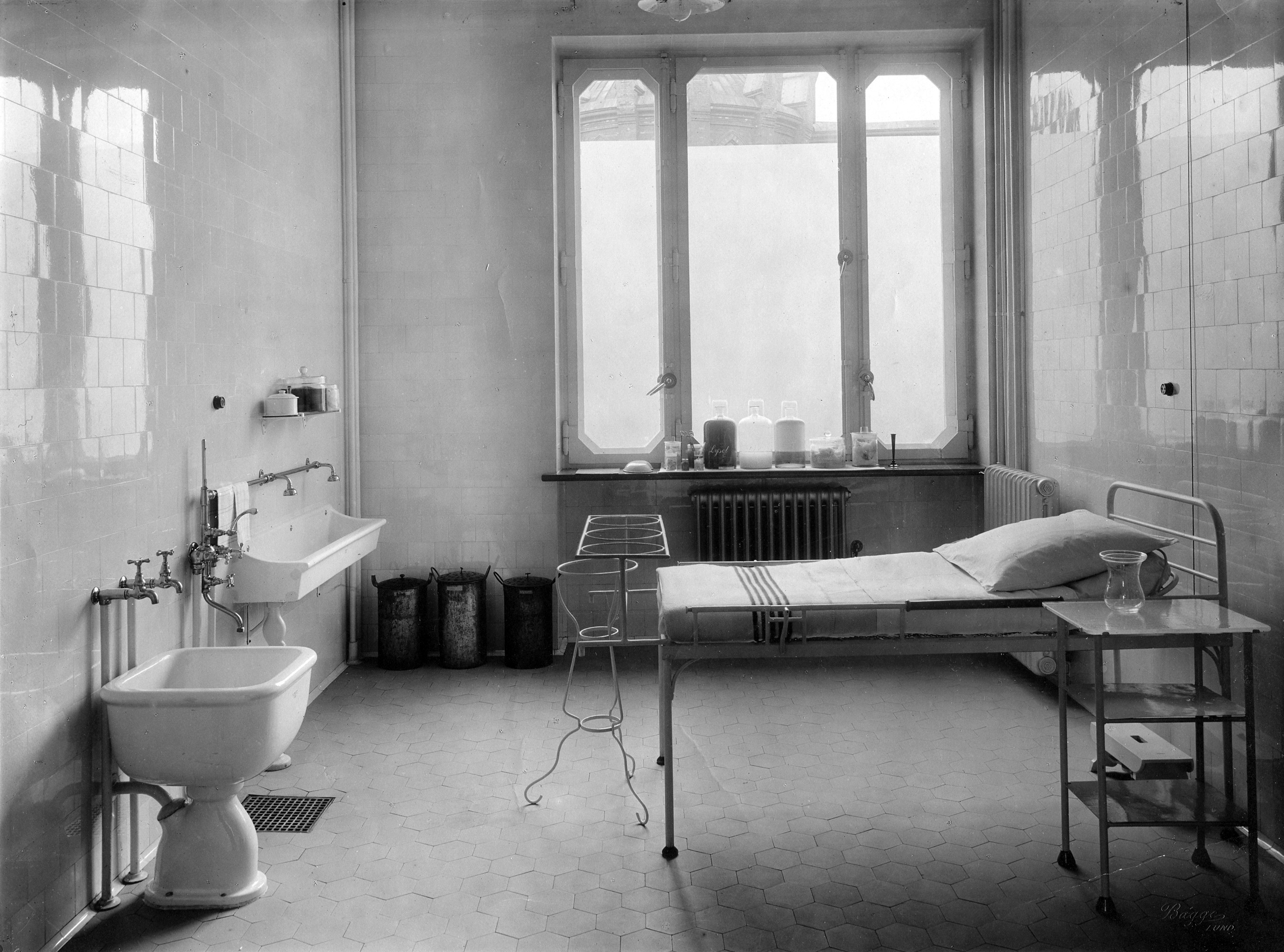 Förlossningsrum från 1918 på kvinnokliniken på norra lasarettsområdet. Den togs i bruk detta år, och samma typ av förlossningsbrits, handfat och barnbadkar finns avbildade i Borelius 1918.