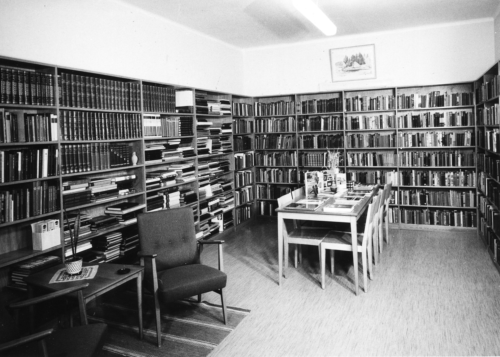 Påskrift: "Biblioteket på gamla ortopeden. LL:s-område norr: interiör". - Foto monterat på kartong. Fotograf okänd.