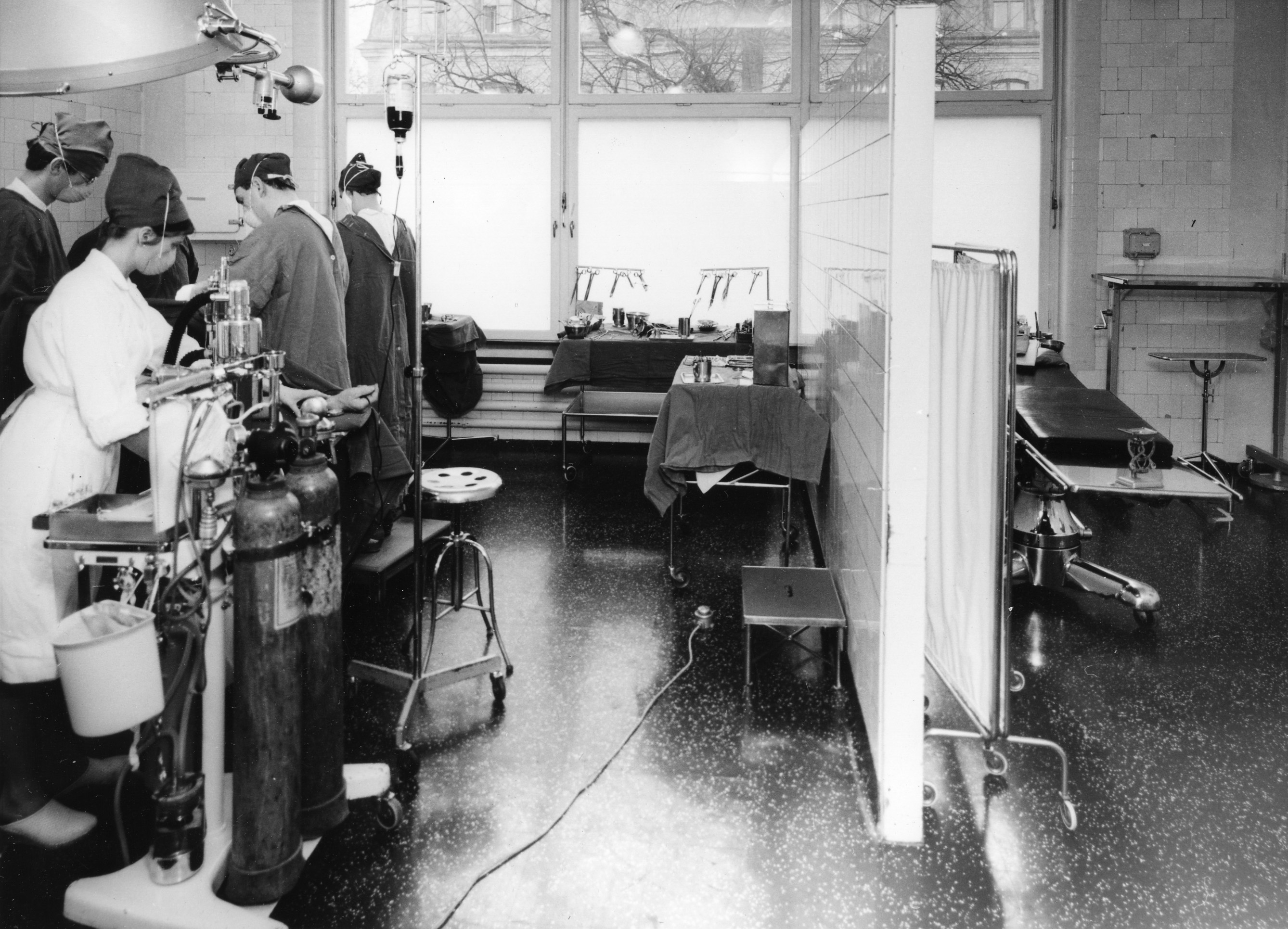 En operation på kirurgiska kliniken i Lund omkring 1960. Operationssalarna låg samlade i annexet av år 1905. Narkossköterska: Birgitta Nyman.