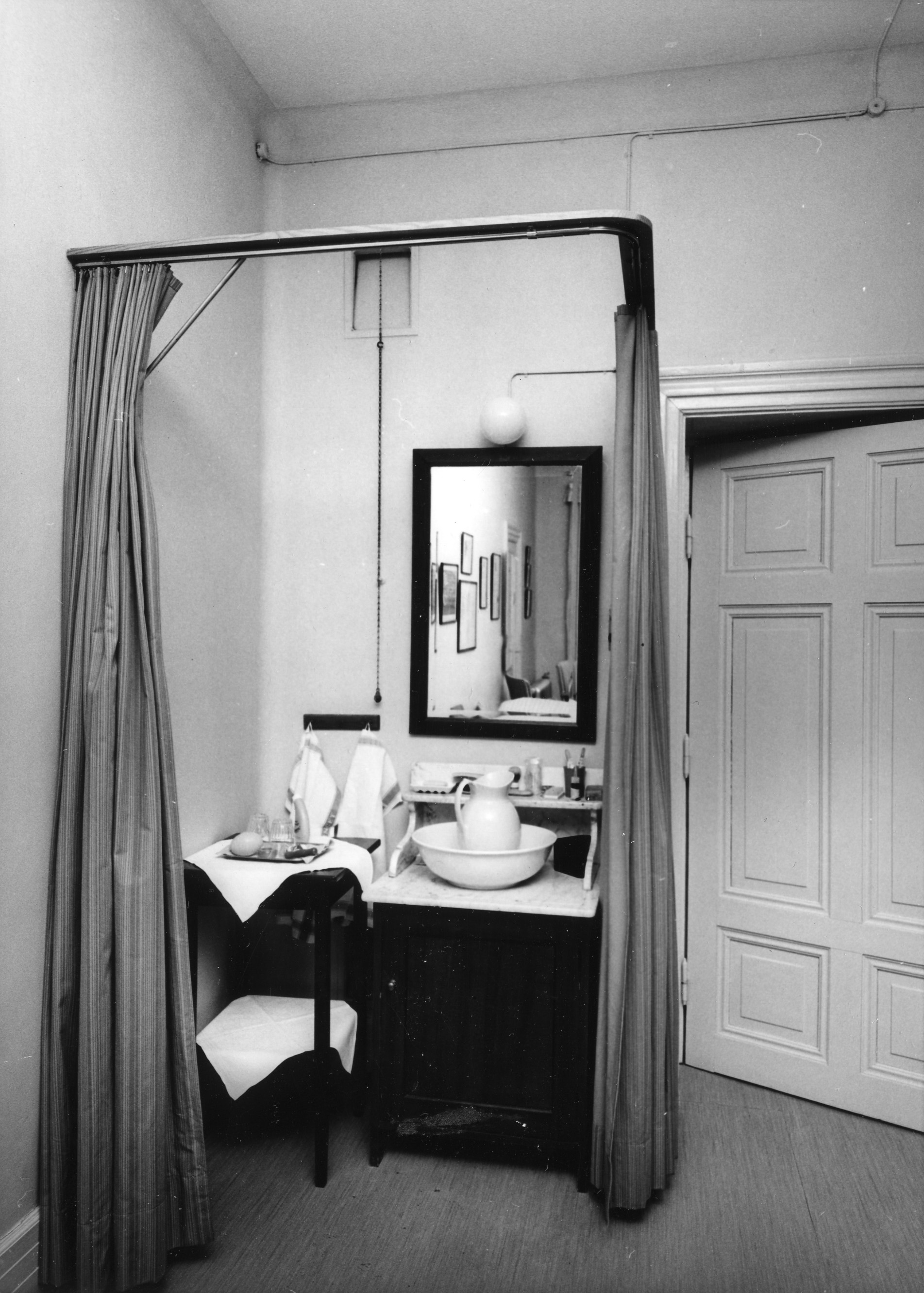 Handfat och tvättställ i professor Nilssons rum på översta våningen på gamla kirurgiska kliniken i Lund. Sova över i rummet gick bra, men rinnande vatten och avlopp fanns som synes inte ...