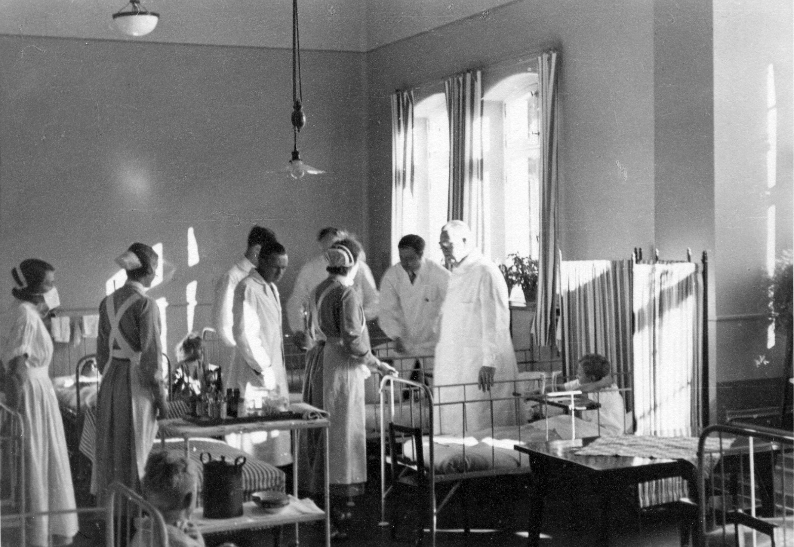 Prof. Gustaf Petrén går rond på en barnavdelning på kirurgiska kliniken i Lund i mars 1937.