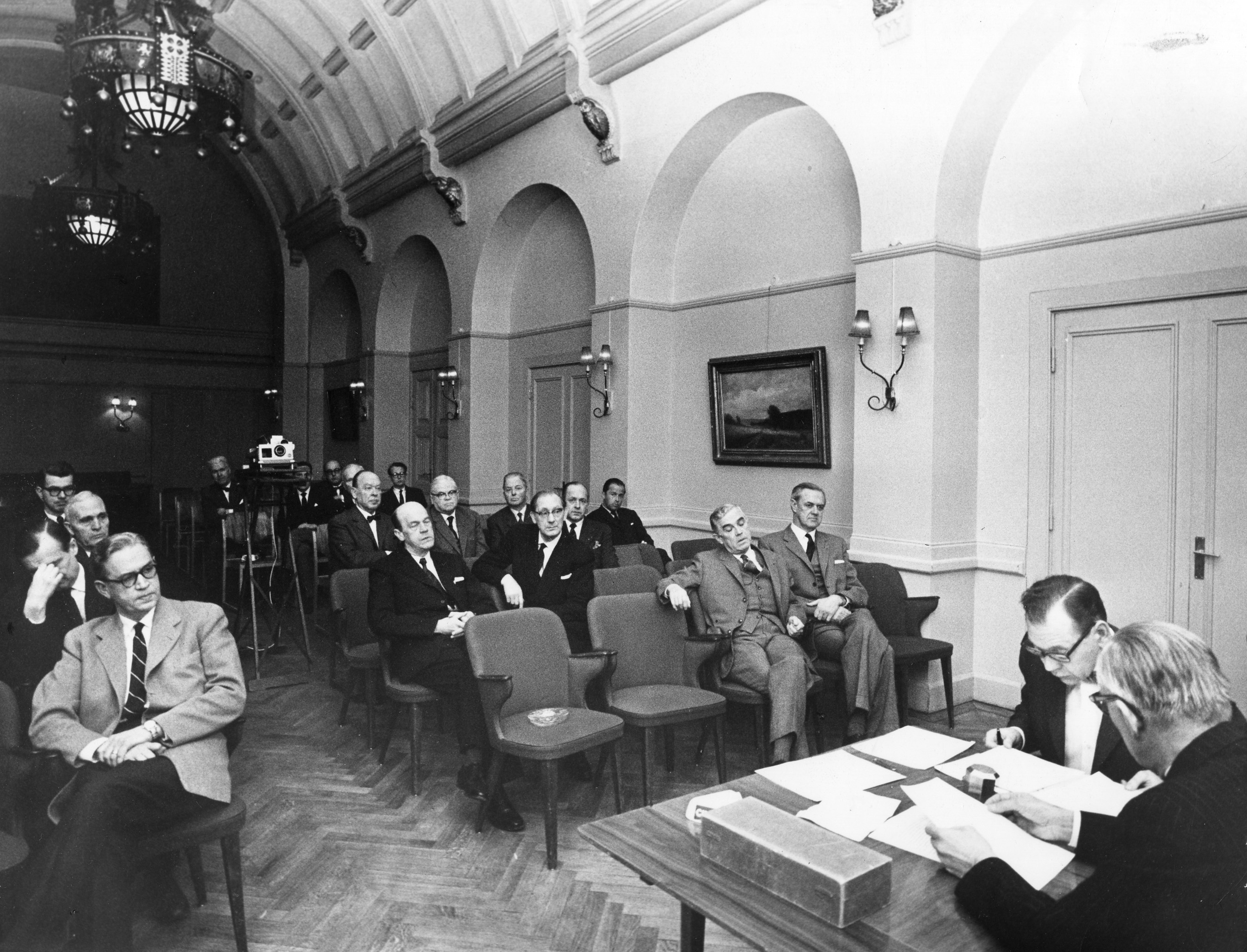 Bakom Hjalmar Koch sitter Olle Dahlbäck och gömmer ansiktet i handen. Snett bakom Alfred Flaum och till höger i bilden sitter Tord Gülich. Ytterligare ett steg åt höger sitter Anders Biörklund, öronläkare. Längre bak i salen syns urologen Lennart Andersson (glasögon, närmast väggen).