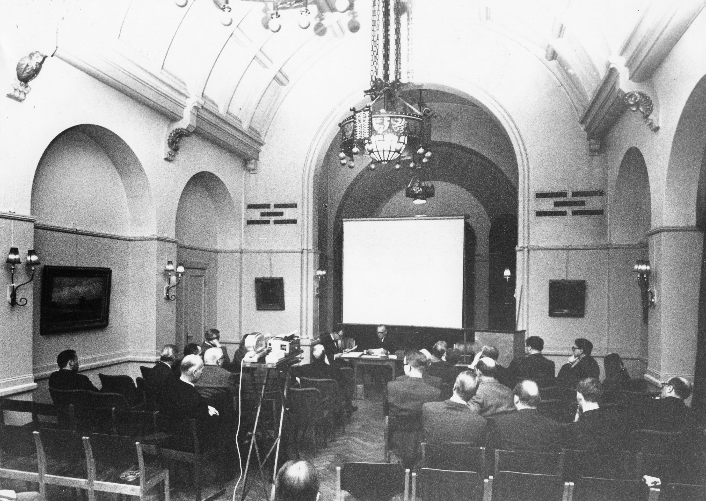 Sammanträdeslokalen är Lilla Salen på Akademiska Föreningen. Tidpunkten bör vara något av åren runt 1960. Bilden finns publicerad på sidan 52 i Flaum (1962): Läkarsällskapet i Lund 100 år.