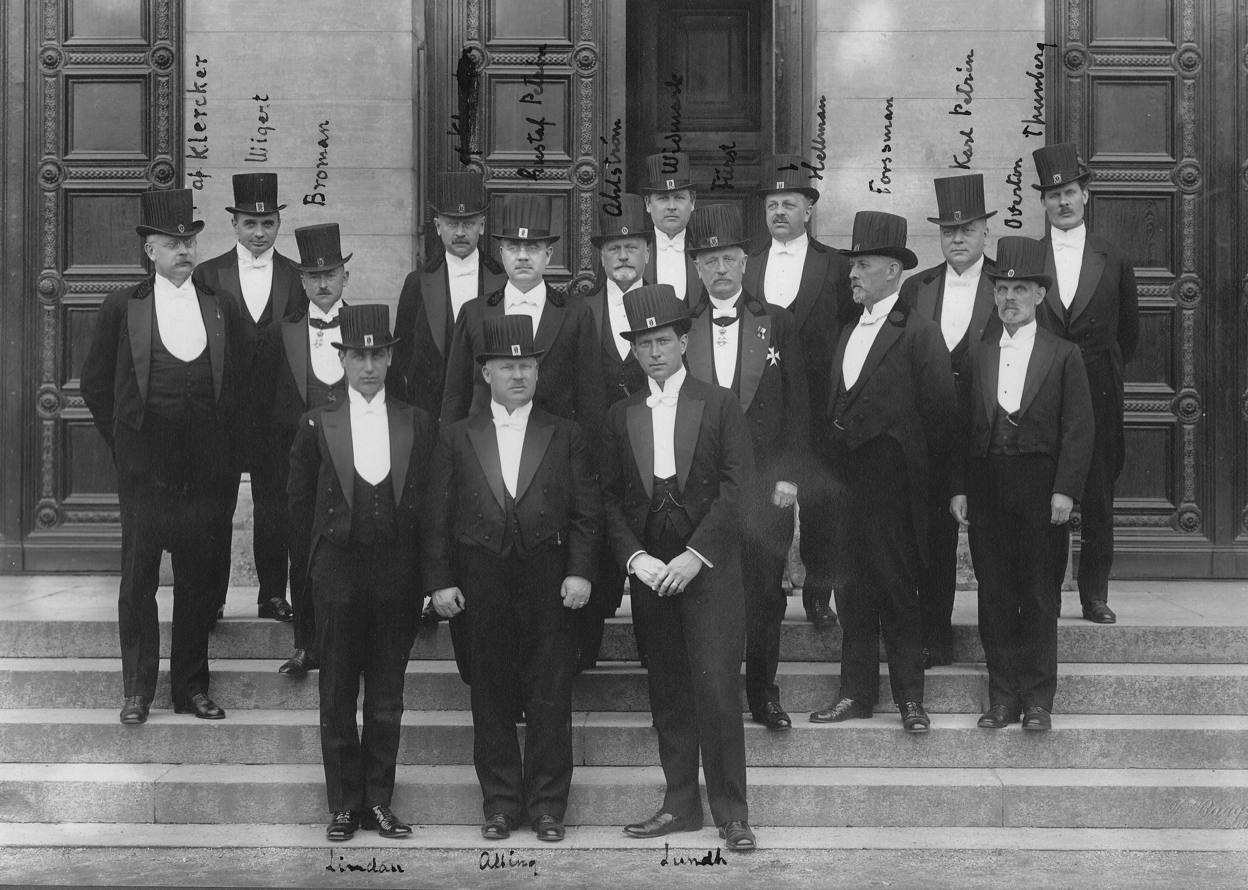 Bakre raden (=fakultetens professorer), från vänster: Kjell-Otto af Klercker (pediatrik), Victor Wigert (psykiatri), Ivar Broman (anatomi), Elis Essen-Möller (gynekologi), Gustaf Petrén (kirurgi), Gustaf Ahlström (oftalmologi), Erik Widmark (medicinsk kemi), Carl M. Fürst (anatomi), Torsten Hellman (mikroskopisk anatomi / histologi), Karl Petrén (internmedicin), Ernest Overton (farmakologi), Torsten Thunberg (fysiologi).